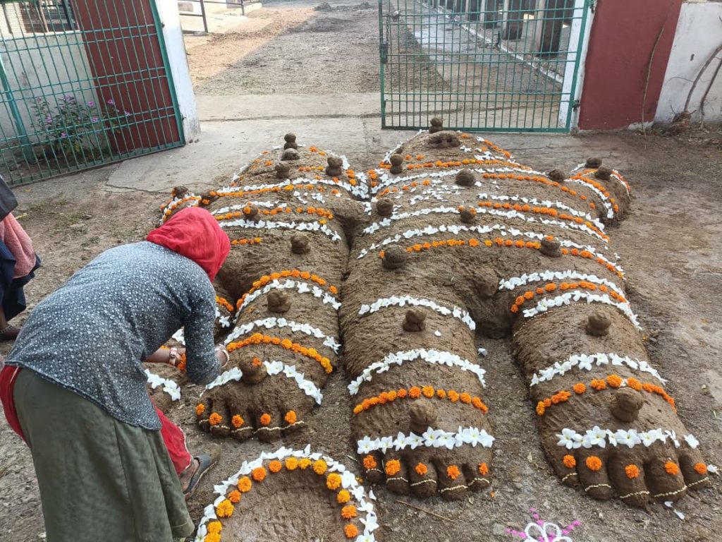 उदयपुर जिले के बड़गांव में स्थित कृषि विज्ञान केंद्र बुधवार को श्रद्धा, भक्ति और परंपरा का अद्भुत संगम बन गया। दीपावली के अगले दिन मनाए जाने वाले गोवर्धन पूजा पर्व के अवसर पर यहां हर साल की तरह इस बार भी गोबर से भगवान श्रीकृष्ण और बलराम के जीवंत प्रतिरूप तैयार किए गए। इन विशालकाय प्रतिरूपों की पूजा विधिविधान से की गई और फिर गौशाला की गायों को इन पर छोड़ा गया। मान्यता है कि ऐसा करने से गोवंश की समृद्धि होती है और प्रकृति संरक्षण का आशीर्वाद प्राप्त होता है।