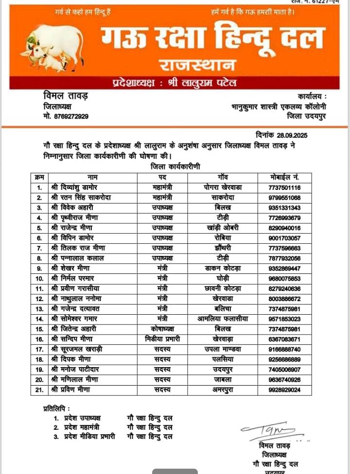 राजस्थान I गौ रक्षा हिन्दु दल राजस्थान की जिला कार्यकारिणी की घोषणा कर दी गई है। प्रदेशाध्यक्ष लालूराम की अनुशंषा पर जिलाध्यक्ष विमल तावड़ ने नई कार्यकारिणी घोषित की। इसमें रतनसिंह साकरोदा को जिला महामंत्री की जिम्मेदारी सौंपी गई है।जिला स्तर पर संगठन को मजबूती देने और आगामी कार्ययोजना को लेकर की गई इस नियुक्ति में अन्य पदाधिकारियों को भी जिम्मेदारी दी गई है। कार्यकारिणी लिस्ट के अनुसार अलग-अलग क्षेत्रों से सक्रिय कार्यकर्ताओं को स्थान दिया गया है।इस मौके पर जिलाध्यक्ष विमल तावड़ ने कहा कि संगठन गौ रक्षा और हिंदुत्व की विचारधारा के प्रति समर्पित है और नई कार्यकारिणी से जिले में संगठन की मजबूती और जनसंपर्क का विस्तार होगा। प्रदेशाध्यक्ष लालूराम ने नव नियुक्त पदाधिकारियों को बधाई देते हुए अपेक्षा जताई कि सभी कार्यकर्ता संगठन के उद्देश्य को जन-जन तक पहुंचाने का कार्य करेंगे।