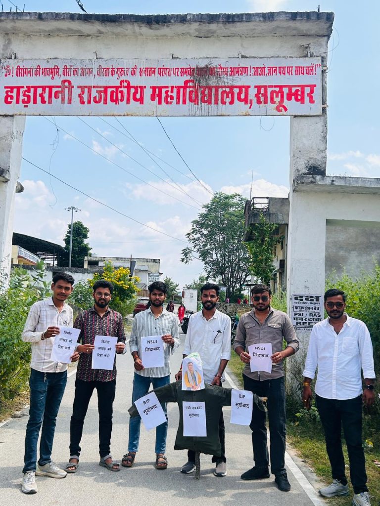 एनएसयूआई जिलाध्यक्ष महेंद्र सिंह बस्सी के नेतृत्व में बड़ी संख्या में कार्यकर्ता हाडा रानी पीजी कॉलेज के गेट पर एकत्रित हुए। प्रदर्शनकारियों ने सरकार और प्रशासन के खिलाफ नारेबाजी की और मुख्यमंत्री भजनलाल का पुतला दहन कर विरोध जताया।