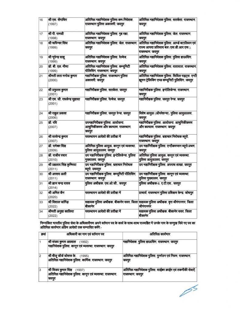 राजस्थान में लंबे समय बाद पुलिस महकमे में बड़ा फेरबदल हुआ है. प्रदेश में कुल 34 पुलिस अधिकारियों के ट्रांसफर किए गए हैं. बुधवार को 34 आईपीएस अफसरों के ट्रांसफर लिस्ट आने के साथ जयपुर पुलिस कमिश्नर भी बदल गए हैं. सचिन मित्तल को जयपुर का नया पुलिस कमिश्नर नियुक्त किया गया है, जबकि बीजू जॉर्ज जोसेफ को अतिरिक्त महानिदेशक पुलिस (कार्मिक) बनाया गया है. कार्मिक विभाग की ओर से जारी लिस्ट में 5 आईपीएस अधिकारियों को अतिरिक्त जिम्मेदारी दी गई है.