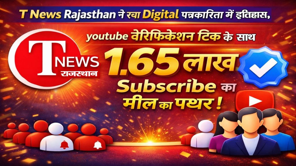 Rajasthan। राजस्थान की क्षेत्रीय डिजिटल पत्रकारिता में अपनी निष्पक्ष, निर्भीक और जनसरोकारों से जुड़ी पहचान बना चुका T News Rajasthan ने एक और ऐतिहासिक उपलब्धि हासिल की है। यूट्यूब की ओर से चैनल को आधिकारिक वेरिफिकेशन टिक प्रदान किया गया है, वहीं चैनल के सब्सक्राइबर्स की संख्या 1 लाख 65 हजार के आंकड़े को पार कर चुकी है। यह उपलब्धि न केवल तकनीकी मान्यता है, बल्कि सच्ची और विश्वसनीय पत्रकारिता के प्रति दर्शकों के अटूट विश्वास की पुष्टि भी है।